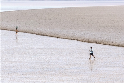 一个抢潮头鱼的人,一边举着手机拍摄,一边和潮水赛跑。