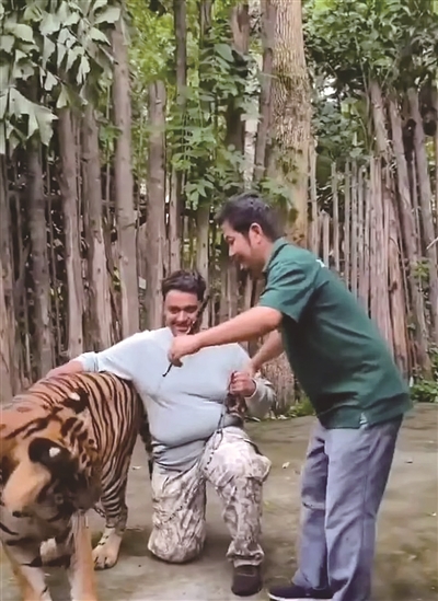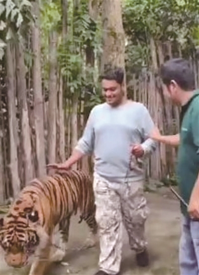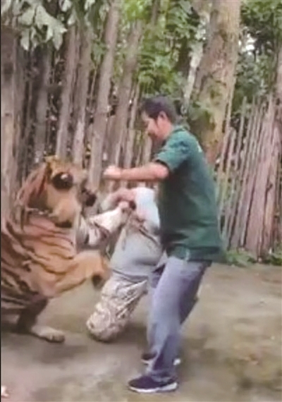 英国《镜报》5月31日报道,视频中,游客牵着链子走在老虎旁边,并蹲下来摆出姿势准备拍照。驯兽师用一根棍子命令老虎坐下,游客用胳膊搂住老虎的背部,这时老虎突然发怒,反身袭击游客。游客发出尖叫声。工作人员介入营救,游客受轻伤。