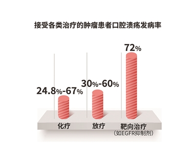据统计,30%-60%的放疗患者、24.8%-67%的化疗患者会发生口腔黏膜炎症,而靶向治疗(如EGFR抑制剂)相关口腔溃疡的发病率更高,可达72%。这些溃疡不仅疼痛剧烈,还常导致进食困难、口干、味觉障碍等,严重影响患者的生活质量。部分患者甚至因无法耐受副作用而被迫减药或停药,错过了最佳治疗时机。