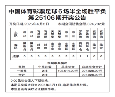 中国体育彩票足球6场半全场胜平负 第25106期开奖公告