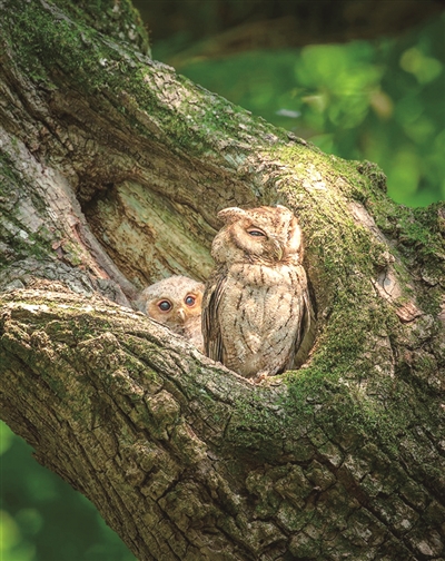 植物园的一棵大树上,前些天住进来一家领角鸮(xiāo),俗名猫头鹰。很多人带着“长枪短炮”守在树下,其中有来自北京上海的游客和摄影爱好者。