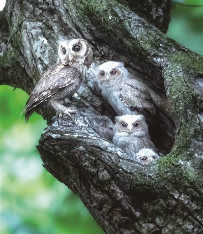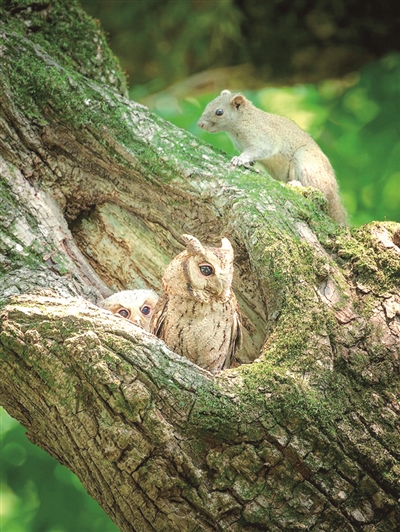 大树洞里,猫头鹰一家正在休养,突然一只松鼠跳过来,与这家子同框互动……这神奇一幕发生在杭州植物园。