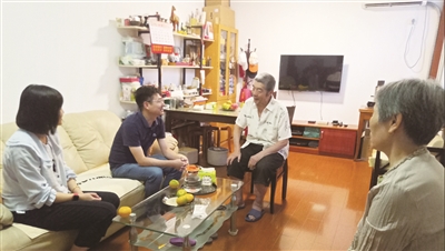 闸弄口街道退役军人服务站工作人员在翟大伯家,左一为李俐静。