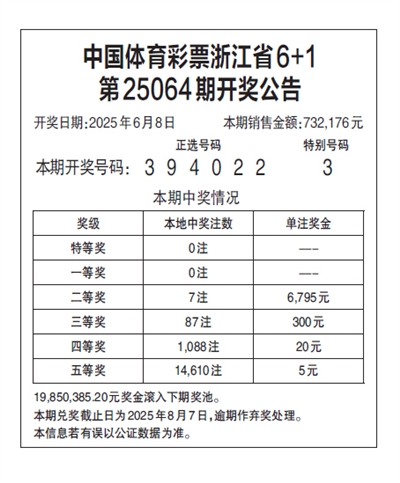 中国体育彩票浙江省6+1 第25064期开奖公告