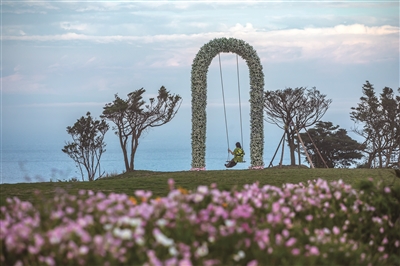 花鸟岛码塔草坪公园,游客体验海景秋千。