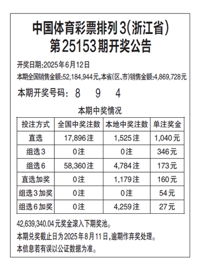 中国体育彩票排列3(浙江省) 第25153期开奖公告