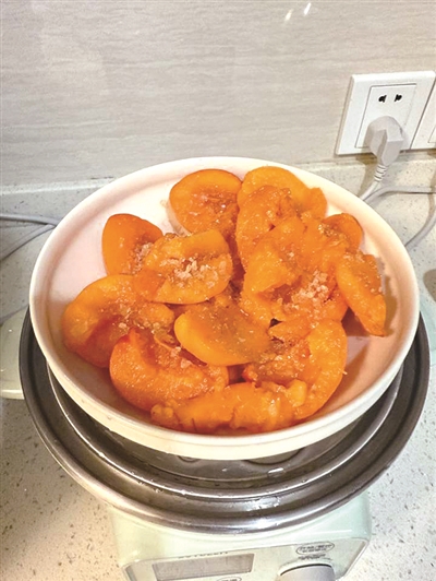 橙友“曼莉”:#夏日甜品#买了杏子,洗净去核,撒点碎冰糖上锅做杏子酱,那叫一个鲜啊,可惜有点小贵,6颗杏子19块。