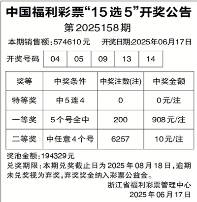 中国福利彩票“15选5”开奖公告
