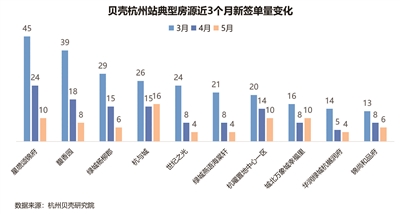 据杭州贝壳研究院数据,部分次新房成交量逐月下滑。最明显的如拱墅区申花板块,星瓒颂锦府3月份成交45套,4月份成交24套,5月份只卖了10套;馥香园走势类似,3月份成交39套,4月份下滑至18套,5月份仅成交8套。勾庄板块的燕语海棠轩,成交数据同样下滑明显。