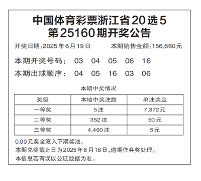 中国体育彩票浙江省20选5 第25160期开奖公告