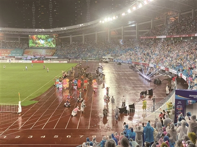 下午5点半,球迷开始进场。入场要过两道安检,先检查身份证,第二道是刷脸,打火机、雨伞、瓶装水都不能带进去。
