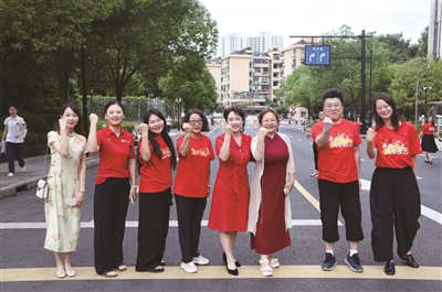 杭州第六中学的初三老师们身着亮眼“稳赢”红装,早早守候考点大门。他们与奔赴考场的学子击掌、拥抱,声声“加油”传递力量。