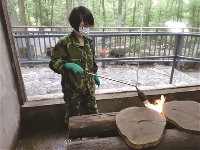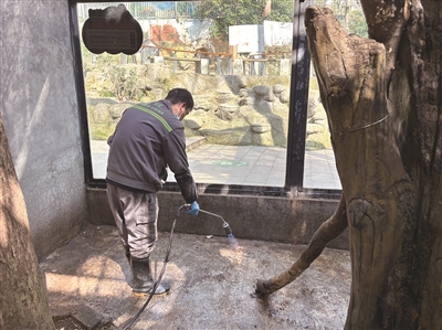 每天清晨,保育员都会先将动物笼舍内的粪便清扫干净,然后用消毒药水对笼舍地面进行消毒,最后用清水冲洗;每隔一段时间,他们会用火焰枪喷杀那些藏在栖架缝隙里的虫卵,让它们在高温下烈焰焚身。“环境消杀不是简单的‘喷药’,而是切断寄生虫从卵到成虫的每一条生路。”