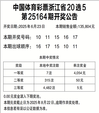 中国体育彩票浙江省20选5 第25164期开奖公告