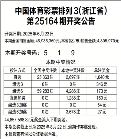 中国体育彩票排列3(浙江省) 第25164期开奖公告