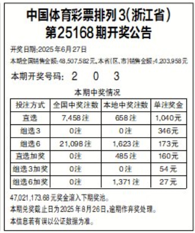 中国体育彩票排列3(浙江省) 第25168期开奖公告