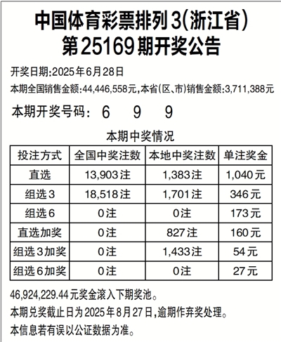 中国体育彩票排列3(浙江省) 第25169期开奖公告