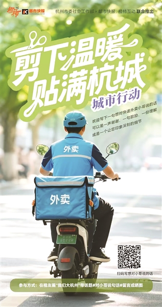 今天起,杭州市委社会工作部联合都市快报、橙柿互动共同推出“骑暖杭州 一起同行”杭州市“小哥友好城市”建设系列活动,发起“剪下温暖 贴满杭城”城市行动。
