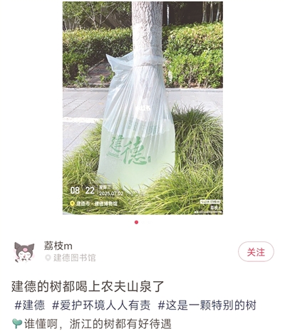 建德网友“荔枝m”发帖,“建德的树都喝上农夫山泉了”,照片上每棵树挂着装满水的大水袋。有人跟帖解释,袋子最下面有细微小孔,不断渗水流进泥土,“每年夏天太热,都会给树补水喝。”