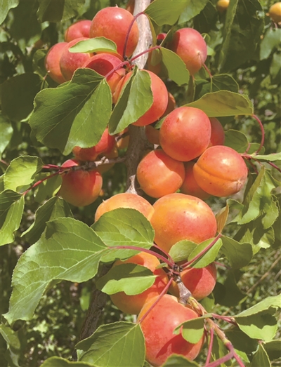 “红杏出天山,颗颗如蜜甜”。小红杏长于枝头,熟后不掉落,故又称“吊干杏”,需要人工爬树采摘。