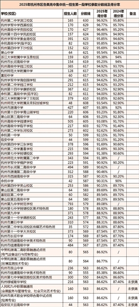 学军紫金港和余杭高级中学(临平区),得分率95.85%,在录取分数线表中排名并列第5。