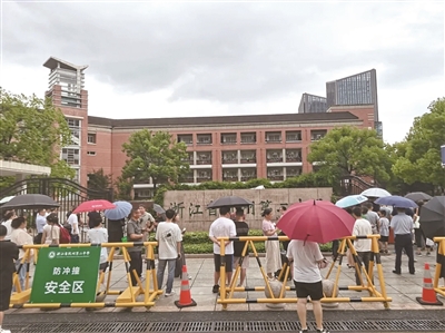昨天下午3点多,正是雨大的时候,学军中学校门口围满了等待的家长,新高一的分班考结束了,同学们陆续走出校门。