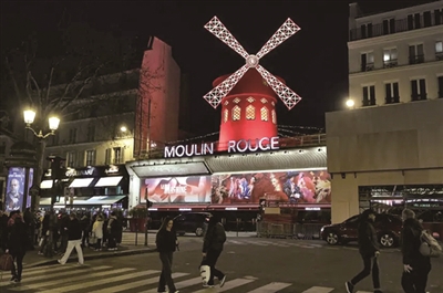 红磨坊歌舞厅始建于1889年,以上演“康康舞”闻名世界,其屋顶上的红色磨坊风车是巴黎地标建筑。