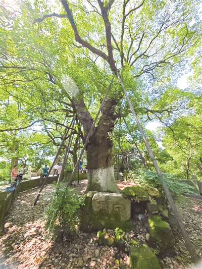 有美堂虽已不存,但历史的碎片会藏在其他角落。在遗址附近逛逛,你会发现举目皆是苍劲挺拔、翠盖如云的古樟树,其中一棵古树下的石头上还刻着“宋樟”二字。这些宋元时期就种下的古樟树也是吴山的一大特色景观。资料显示,吴山景区多古树名木,现登记在册的古树共有78棵,其中樟树最多,共49棵,而且很多都有700多岁了。相传,宋人喜种樟树,认为樟树长寿,如今看来,确实名不虚传。