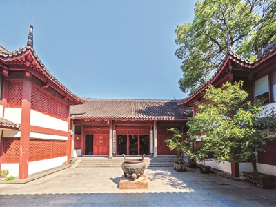 离开小普陀继续南行,几十步后,可以看到“吴山大观”影壁,影壁后有一座四合院式的仿古建筑,名三官庙,始建于宋代,原名承天灵应庙,后因供奉有天、地、水府的三官堂,俗称为三官庙,昔日香火也是极盛。