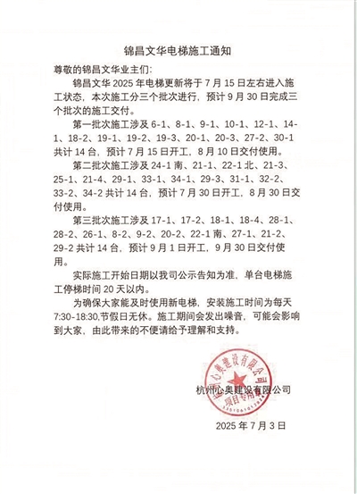 对于这位橙友的建议,拱墅区紫荆家园社区回复:锦昌文华苑小区电梯更新分批次进行,去年完成了8台,今年计划更新42台,6月14日完成合同签订。42台电梯分三批施工,第一批原计划7月17日左右开工,8月6日左右交付。施工单位提前7天发布告知,让业主有足够时间安排生活。14幢是独幢,暑期施工对居民出行确实有影响,对业主想要延迟施工的诉求,社区能理解。