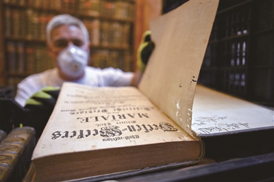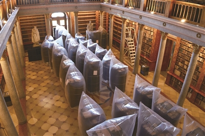 在匈牙利西北部潘诺豪尔玛修道院,图书馆里有40万册藏书,大约四分之一藏书因遭受书虫威胁,修复师们正从图书馆书架上移走约10万本手工装订的书,小心地放进板条箱除虫。