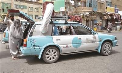 阿富汗南部城市坎大哈正值炎炎夏日,气温动辄超过40摄氏度,而这里的出租车普遍车况差,没装空调或空调“不管用”,修理又很贵。司机们于是想了个好办法:把一个冷却器固定在车顶,接一根粗管将冷气送入车内。