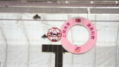 “足球”的重量很轻,算上电池只有200克,两个圆圈形球门距离地面2.3米。