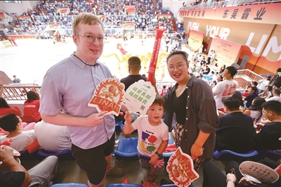 建德vs临安,来自英国的临安女婿Chris一家三口,不停地摇着手中的“天目雄狮”助威扇,为临安加油。助威战袍更广受欢迎,建德的战袍胸前是“17℃冰锋”造型,不光好看,更显归属感。