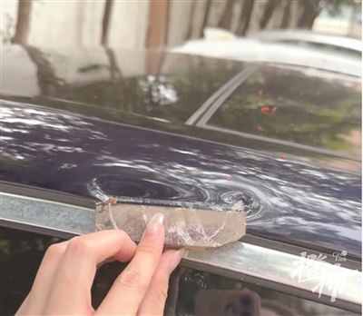 记者看到,张女士的车顶有一处明显凹陷,划痕有8cm长,张女士后来报了警,把掉落砖块交给民警调查。从图片可以看到,掉落的砖块长条状,与车顶伤痕基本吻合,表面稍有褪色,有些白色纹饰。