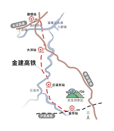 由于杭黄高铁和沪昆高铁在出杭州后各自南延,杭黄高铁途经桐庐、建德等地,沪昆高铁途经义乌、金华等地,新建的金建高铁,相当于在这两条高铁线之间“搭了一座桥”,将它们连接了起来。未来从杭州西站坐高铁可以直接到达兰溪。