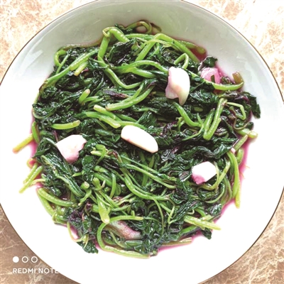 橙友“西溪玩人”:#养生夏菜# 夏日里常做的蒜泥苋菜。大蒜煸香,加入苋菜翻炒,再佐以盐、味精。红紫绿相间,色香味俱全,有营养,振食欲。