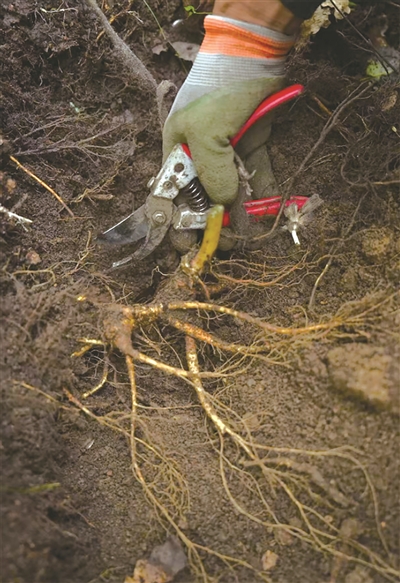 这些挖参工都有二十多年的丰富经验,不多久就能挖出一株。但挖参得蹲着、趴着、跪着,用镐子、锯子、钳子、扦子、手套,一点一点,把参完整地掏出来。