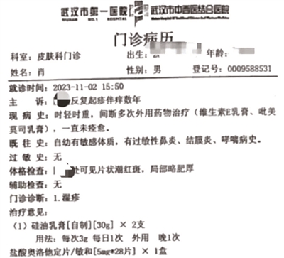 武汉市第一医院出具的病历报告显示,肖同学自幼就有敏感体质,有过敏性鼻炎、结膜炎、哮喘病史。在体格检查中,也发现阴囊处可见片状潮红斑,局部略肥厚。
