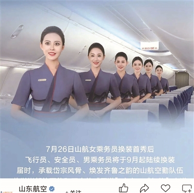 近日,山东航空新制服“青未了”亮相,新制服不仅融合了中国传统汉服元素,还遵循空乘实际需求与舒适体验,女空乘可自选裤装或过膝裙,轻便的平底鞋代替了以往的高跟鞋。