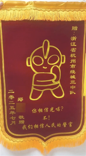 事后,市民郑先生将一面别出心裁的锦旗送到了杭州公安交警绕城大队城西中队,锦旗上的配文格外引人注目:“你相信光吗?不!我们相信人民的警官”。