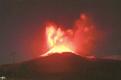 该机构发布的照片显示,火山上空闪烁着闪电,火山灰柱映衬着从山坡上流下的红色熔岩,场面十分壮观。
