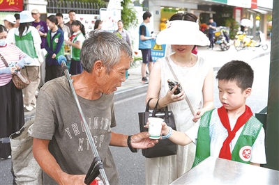 听完故事后,小记者们立刻化身爱心小使者,热情满满地为路人送去凉茶。人群中,小记者叶睿锴格外引人注目,他满脸自豪,骄傲地大声说道:“我已经送出100杯凉茶啦!”他还表示,自己非常敬佩那些坚守在工作岗位上的叔叔阿姨们,即便天气酷热难耐,他们依然坚守在那里,为过往的行人送去清凉与关怀。
