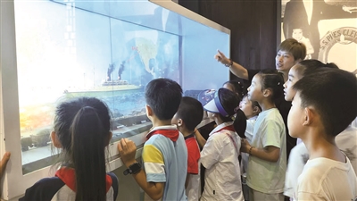 第三站是钱学森纪念馆。在钱学森铜像前,老师提问道:“你们知道钱学森爷爷吗?”小记者们纷纷举起手来。在这里,小记者们学习了解了钱学森的童年时光、求学经历、报国之路。在观看钱学森历尽艰险归国的影像资料时,小记者们屏住呼吸,目不转睛地盯着屏幕,直到看见钱学森乘坐的航船抵达才松了一口气。
