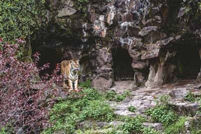虎山外场的绿化丰容也十分丰富,环境与山林相融合,又种植了多种高大的乔木,如青桐、榔榆、臭椿等,还有桃树、构骨、香橼、箬竹等灌木,形成多层次的植物群落,使老虎能够在较为隐蔽的环境中活动。茂密的植被可以有效地遮挡阳光,降低虎山的温度,为老虎创造凉爽舒适的生活环境。随着季节更替,虎山呈现出不同的美景,春天有粉嘟嘟的桃花,夏天有郁郁葱葱的茂林,秋天有黄澄澄的香橼。