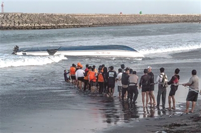 8月5日,在印度尼西亚巴厘岛,工作人员将倾覆快艇拉到岸边。