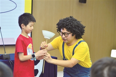 活动现场,浙江省科技馆的金牌科普辅导员团队为大家带来了一场炫酷的科学实验秀。流星锤、杜尚转盘、杆子顶碗……这些道具和小游戏都有一个共同的主题“旋转”,背后蕴含了惯性、离心现象、角动量等科学原理。辅导员老师们生动地展示、幽默地串场和讲解,惹得现场的大朋友小朋友都欢笑声连连,开心之余学到了不少科学知识。