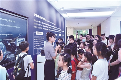 12颗卫星环绕地球的模型,1∶1复刻的计算卫星模型,太空同款的星载智能计算单元……展厅里实物+图文并茂的展示,让遥远抽象的“三体计算星座”变得真实可感。有同学感叹,怎么和想象中卫星的样子不太一样?旁边的家长接话,这就是带你来这里的收获呀,要亲眼看看!