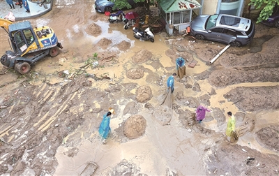 8月5日至6日,广东多地强降水天气持续,各地应急力量进行抢险救援、风险排查,有序开展救灾工作。8月6日,国家防灾减灾救灾委员会对广东启动国家四级救灾应急响应。图为8月6日,工作人员在广东肇庆鼎湖区鼎湖山风景区门口清淤。据新华社