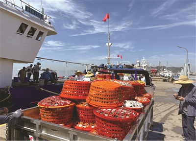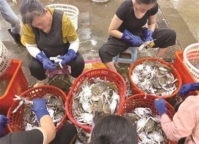 7日上午10点,我又一次来到水产城,让人欣慰的是,水产城终于有了曾经热闹的模样。码头上,好几只船正在卸货,都是一筐筐螃蟹,新鲜诱人,活蹦乱跳。水产城里,不少档口忙着挑蟹,扎蟹。
